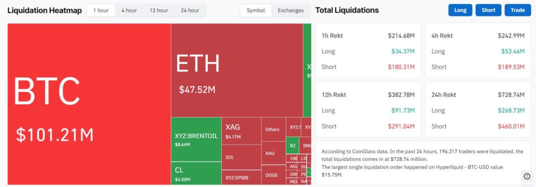 The rally set off a sharp liquidation wave across leveraged crypto positions. CoinGlass data showed about $243 million in liquidations over the past 1 hour, with most of the losses concentrated among traders positioned for further downside.