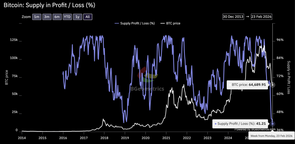However, this weekend, analyst DurdenBTC’s supply in profit tracker had flagged an even harsher read: 44.2% of coins were in profit when Bitcoin was still holding $68,000, a 0th-percentile reading.