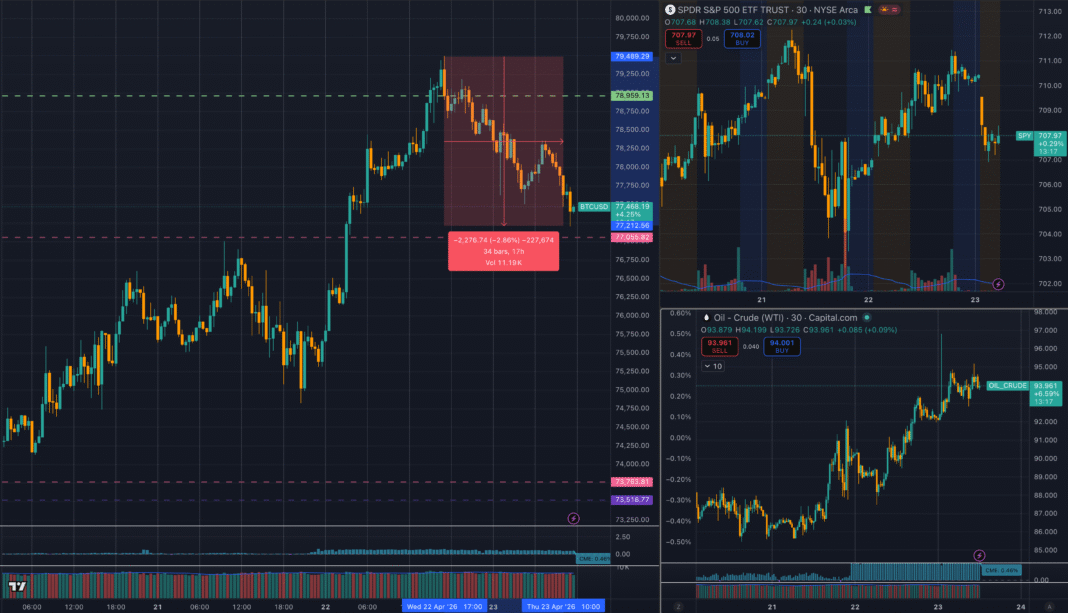The current Bitcoin price chart shows BTC rallying from roughly the mid-$74,000s on Monday, Apr. 20, to a local high near $79,500 yesterday, then reversing by about $2,276 over roughly 17 hours.