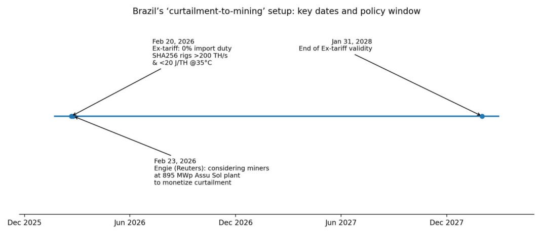Brazil’s zero-percent import duty for high-efficiency mining hardware runs from February 2026 through January 2028, with Engie announcing mining consideration three days after policy launch.