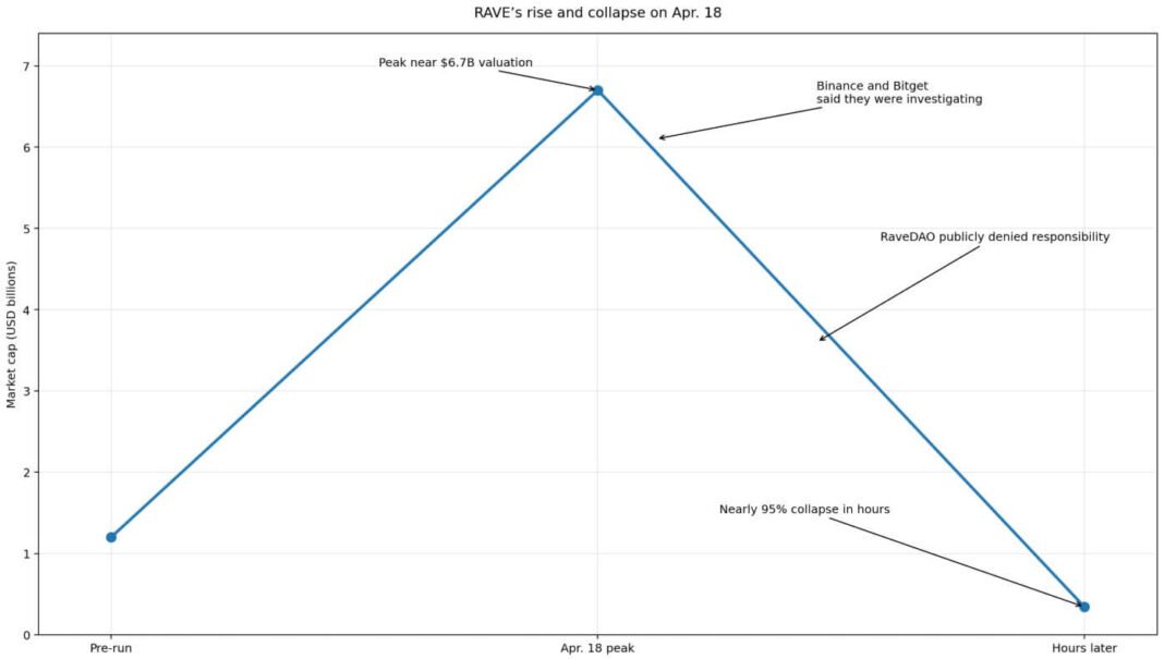 RAVE briefly crossed a $6.7 billion valuation on Apr. 18 before collapsing nearly 95% in hours. The market infrastructure surrounding the token, consisting of thin float, concentrated supply, and a live perpetual market, drove the scale of both the rally and the destruction.