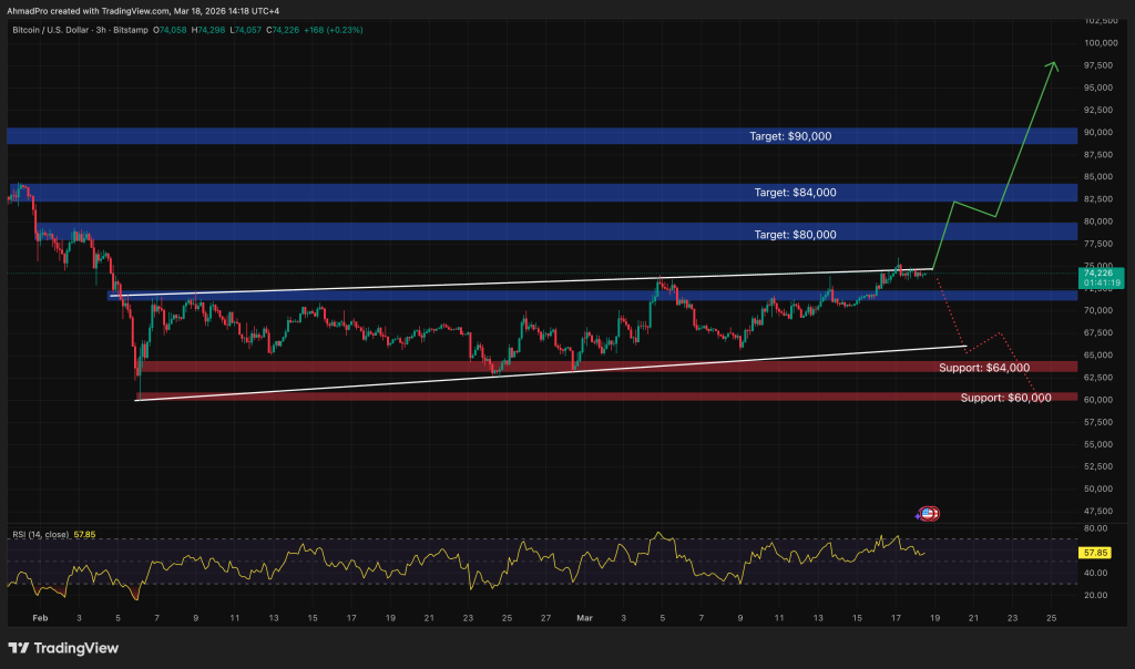 The recent recovery looks promising on the surface. Bitcoin has gained roughly $3,933 over the past six days. But the volume behind the push above $74,000 is thin. Institutional conviction is on pause until the FOMC statement drops.
