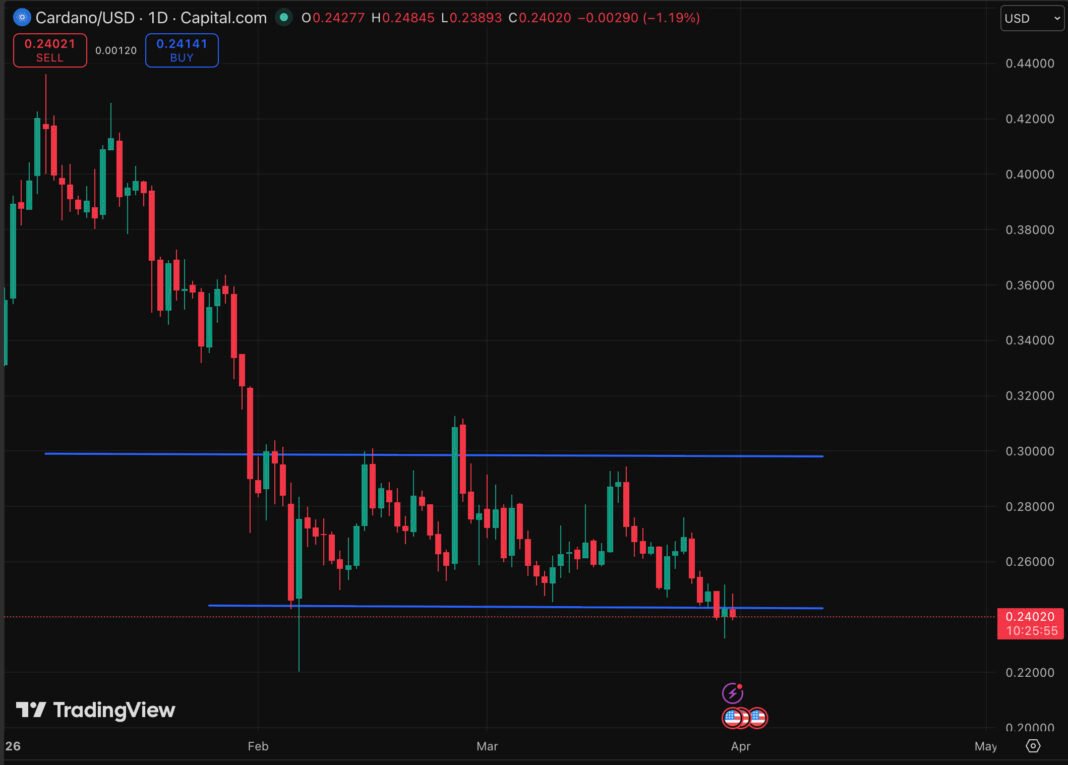 ADA is grinding along a narrow ledge. Support sits at $0.24, or at this current price. Resistance clusters at $0.30 and $0.32, both levels where sellers have been consistent through Q1 2026.
