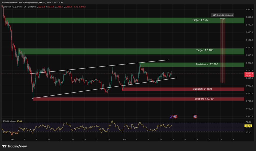 ETH is sitting at $2,063 on the 2h chart, trading inside a rising wedge that has been forming since the February lows.