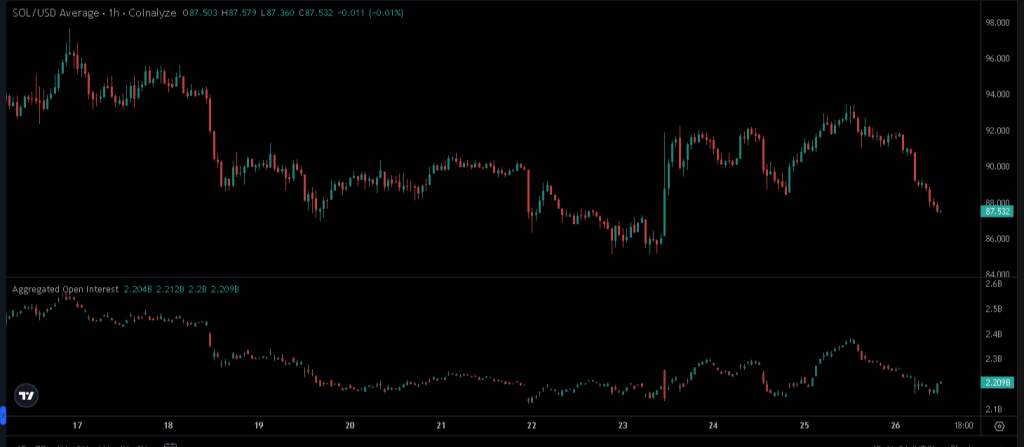Solana (SOL) is trading at $87, still down 69% from its January 2025 peak near $295.91. The long-short ratio has skewed above 3:1 on some platforms with retail sitting 65.5% long. That is not a normal reading for an asset trading below every major moving average.