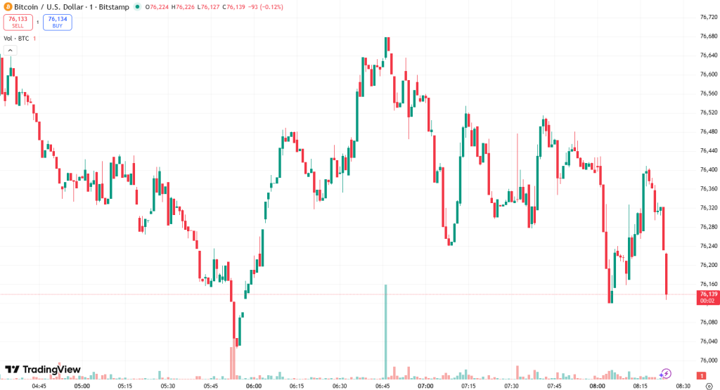 At the time of writing on Wednesday morning, BTC was trading at $76,415. It started the day with its intraday high of $78,902. It then briefly dipped to the daily low of $73,111 before recovering to the current level.